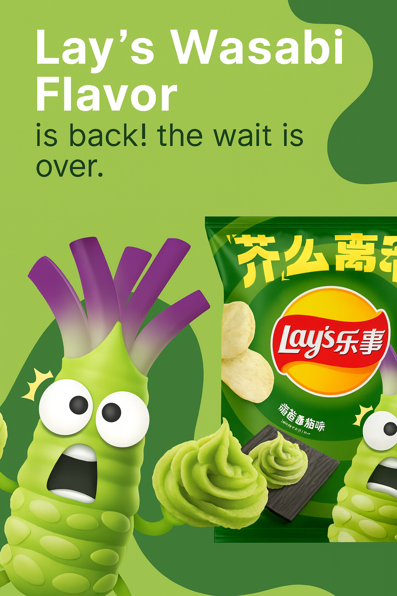 View full detailsLay’s Wasabi Flavor Potato Chips (70g)Turn up the heat with Lay’s Wasabi Chips from China! Crispy, golden potato chips meet the bold kick of wasabi...